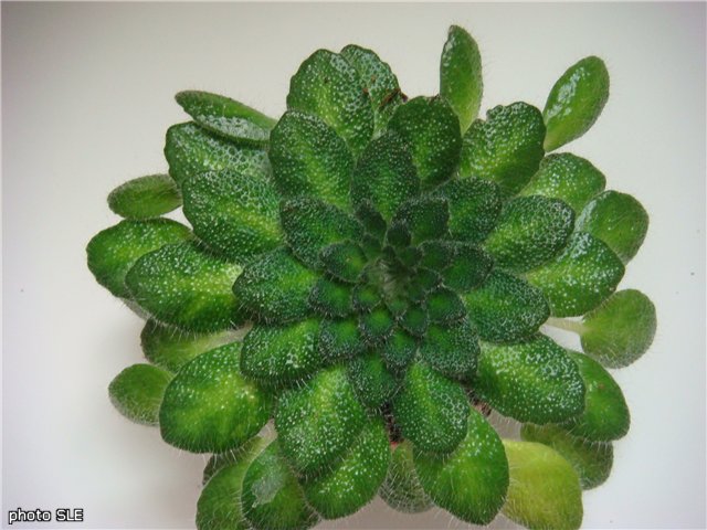Этот вид образует абсолютно симметричную розетку из маленьких округлых блестящих листочков. Их окраска более интенсивная к краям, вдоль центральных жилок становится почти салатовой. Поверхность листа покрыта редкими волосками. Цветы белые