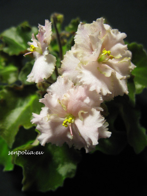 Semidouble copper-pink sticktite pansy/red-brown frilled edge, some green. Dark green, glossy, wavy, serrated. Semiminiature