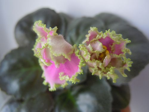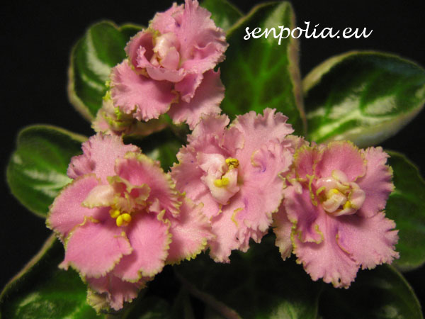 махровые насыщенно-розовые цветы с синими крапинами фэнтази и густо-оборчатым зел краем; темный округлый зубчатый лист. Полумини