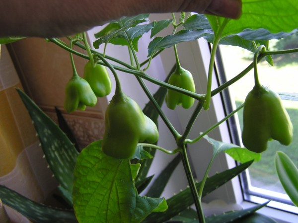 Маша, перчики уже попробовали? Вообще то они должны быть жгучие горькие. Побывала у родителей в гостях, сфотографировала перчик. Была проблема с ними, не хотели цвести или сбрасывали завязи. Всё наладилось как только переставили на другое, более прохладное окно. Как результат - первые перчики и около 14 новых завязей.