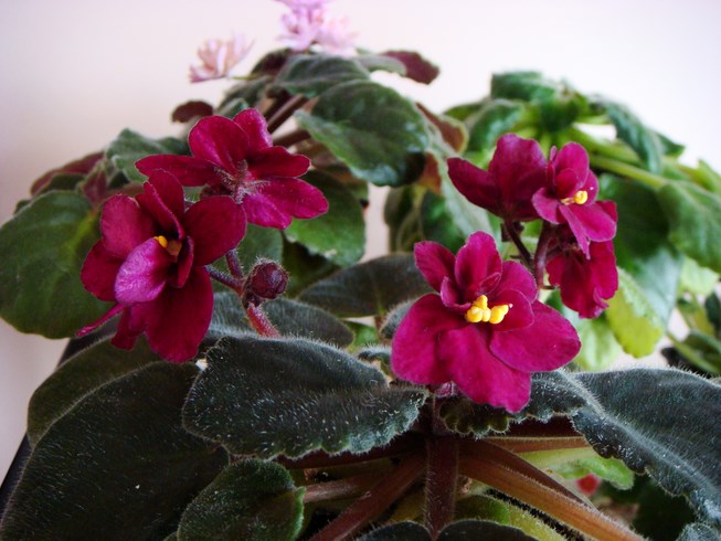 Velvet Gem (S.Sorano) Velvety, dark burgundy double pansies, with "facets" of darker burgundy, fantasy streaks. A good bloomer, the semiminiature foliage is tailored. Бархатистые бургундовые махровые цветы с сеткой темно-бургундовых фантазийных штришков; темно-зеленая листва. Полумини Зацвела первая из 4 деток. Пока не махровая но фэнтази на месте. Розетка ровная и росла без проблем. На фото трудно передать правильный цвет- у меня получается светлее , но за то лутше видно фэнтази.