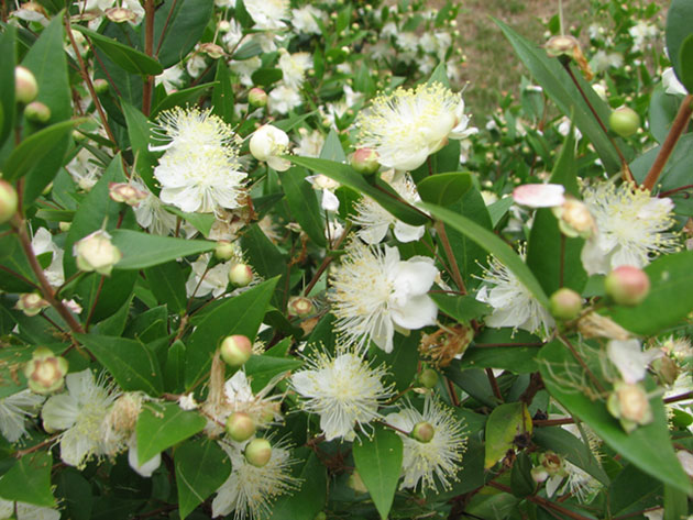 Начиная с 5-летнего возраста мирт цветет мелкими белыми душистыми цветками и плодоносит. Плоды синевато-черные с сизым налетом, грушевидной формы.
