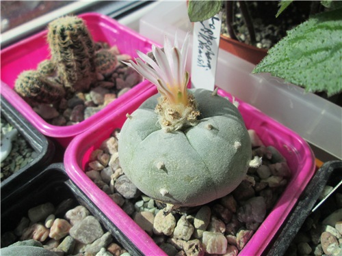 В добавок ко всем прочим зеленякам, обретается у меня группа колючих товарищей и норовит занять все больше места. Самые крупноцветковые - гимнокалициумы и астрофиты. Гимнокалициумы вообще странные кактусы - растут в слабо-кислой почве, а не в доломитово-щелочной, как другие. Для цветения необходимо пересаживать как минимум раз в два года. Это - минус. Астрофиты вообще могут годами расти на кирпичной крошке. На фотках - Gymnocalicium moserianum, и Gymnocalicium michanovichi WK 11 Второй нод подряд цветет лофофора.